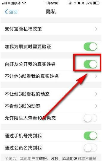 4.在隐私界面,将向好友展示你的真实姓名后面的开关关闭
