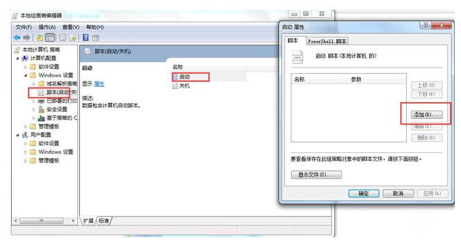 4、按Win+R,在弹出的“运行”里输入\"gpedit.msc\"并按回车打开组策略。在左侧导航栏中依次打开,“计算机配置”-“Windows设置”-“脚本(启动/关机)”。鼠标右键右侧的区域里“启动”选项-“属性”- “添加”-“浏览”-选择刚刚创建的bat文件-单击“打开”-最后点击“确定”。