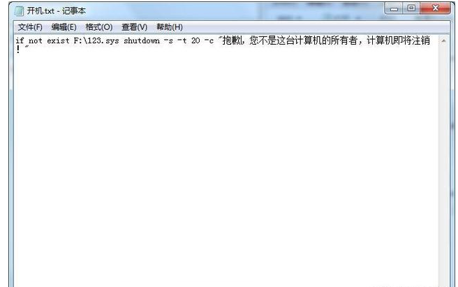 3、在电脑C盘新建记事本:开机.txt,然后输入if not exist F:S.sys shutdown -s -t 20 -c \"抱歉,您不是这台计算机的所有者,计算机即将注销!\",随后保存并重命名为开机.bat。