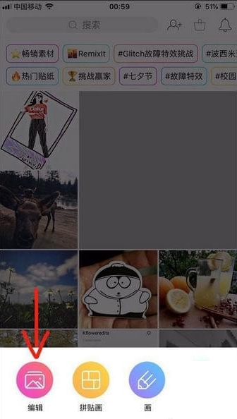 在手机上打开PicsArt软件,点击“编辑”添加底图。