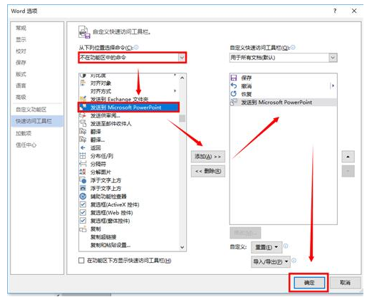 Word想要转成PPT,先要通过【文件】-【选项】-【快速访问工具栏】-【不在功能区的命令】-【发送到Microsoft PowerPoint】-【添加】-【确定】,把图标先固定在页面的上方。