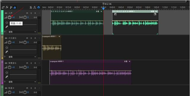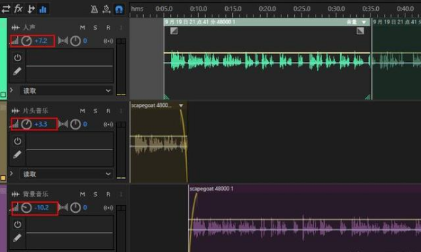 接下来就是调节各个轨道的音量大小,一般片头音乐和人声差不多,背景音乐音量偏小。