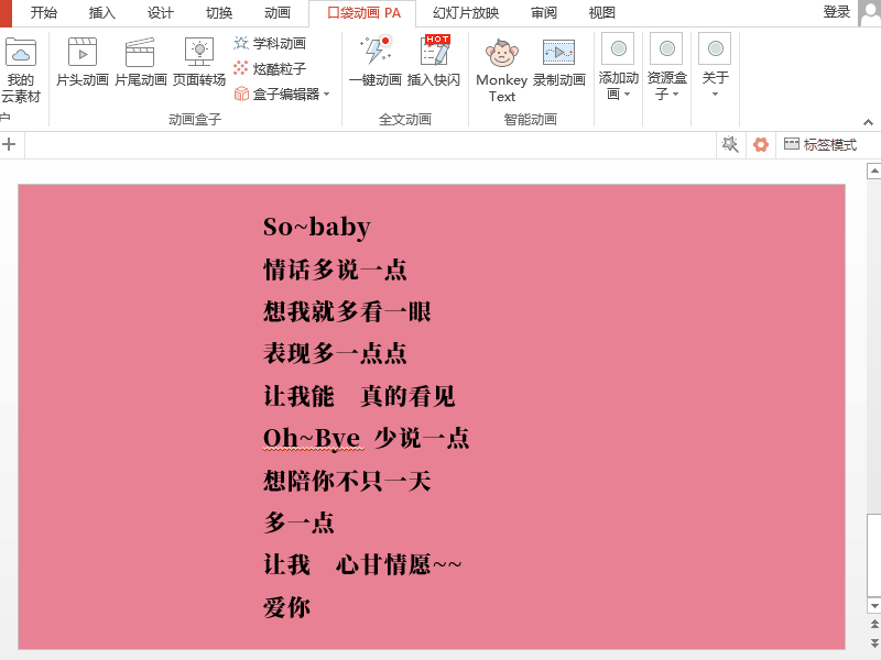 接着,就是到了它出动的时候了。把【口袋动画】的PPT插件安装上,找到这个【Monkey Text】,选择【插入混排】将文字插入后,勾选【自动播放】即可。