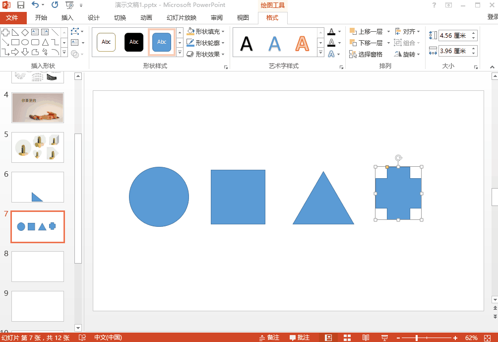 按住Shift键这时的放大缩小是等比例放大缩小的,就不怕图片、形状变形了。