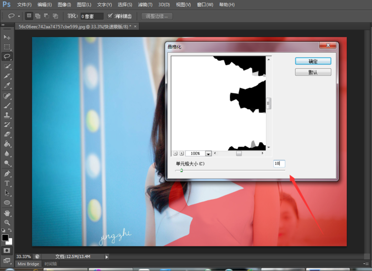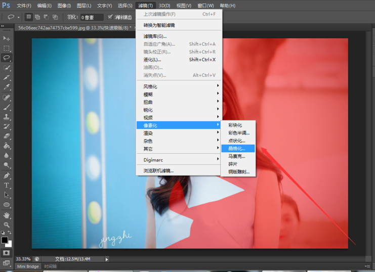 然后点击菜单栏的滤镜——像素化——晶格化,