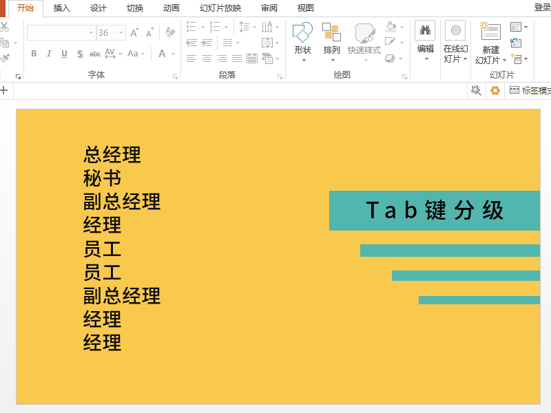 首先是处理文字,根据职位高低对文字进行分级。第一级当然是总经理了,这个不用管;第二级是秘书和副总经理,在他们前面按一下Tab键;第三级是经理,在这前面按两下Tab键;以此类推,直到把所有的文字都分级好。