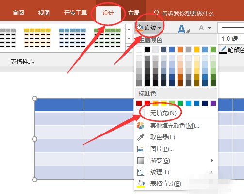 鼠标选中整个表格,点击【表格工具】中的【设计】,在【表格样式】中将【底纹】设置为【无填充】,