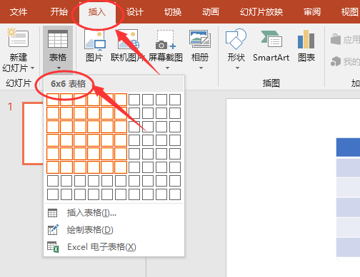 打开PPT,鼠标点击【插入】,选择【表格】,插入一个6乘6的表格,
