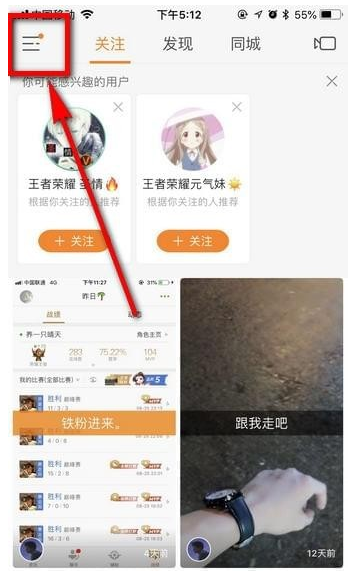 1、打开快手APP,进入界面,点击左上角的横杆,