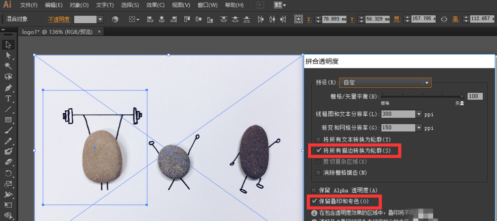 使用剪切蒙版不会破坏原图,使用拼合透明度是直接对原图进行分解,大家根据实际情况来选择方法。