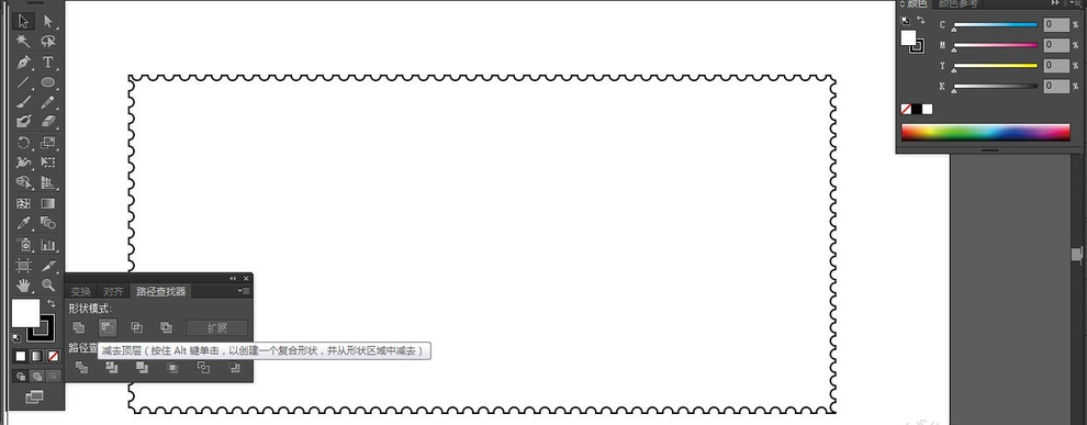 选择全部对像,执行“路径查找器-减去顶层”命令,按快捷键Ctrl+Shift+F9,打开路径查找器,锯形边框就形成了。