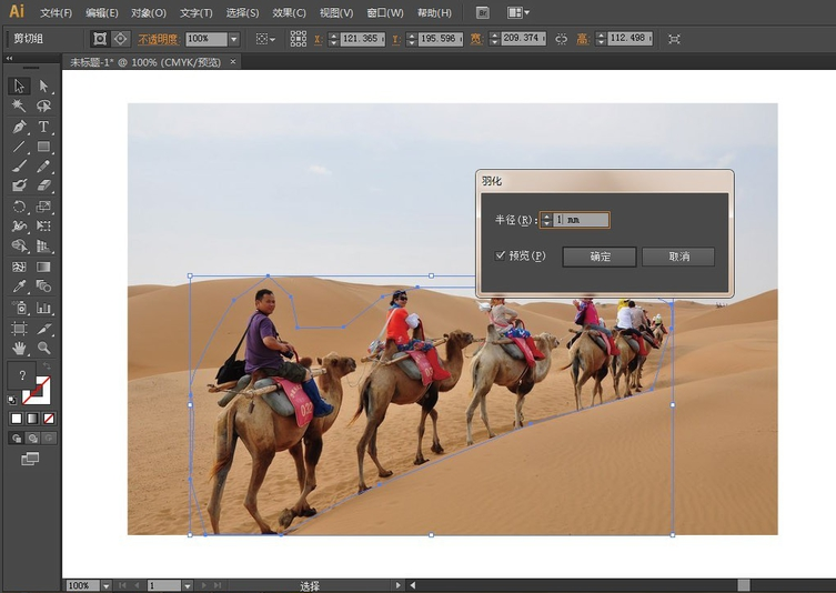 选择路径,执行效果-风格化-羽化命令,设计羽化值为1mm。