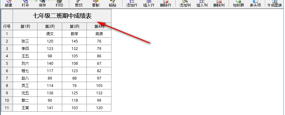 8、例如设置为“七年级二班期中成绩表”下图就是设置的效果