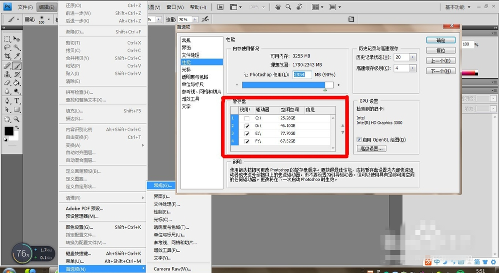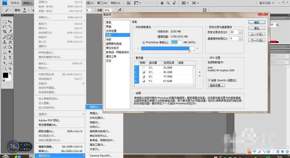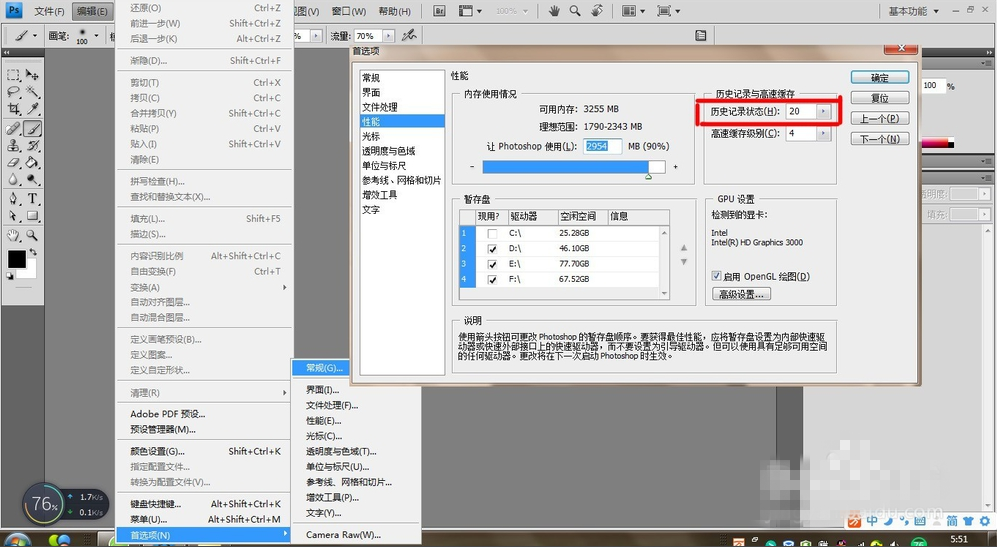 性能参数设置:第一项滑块百分比值,这个值越大越好,越大说明PS可用内存越大,不使用其他工具的前提下可以设置100%,