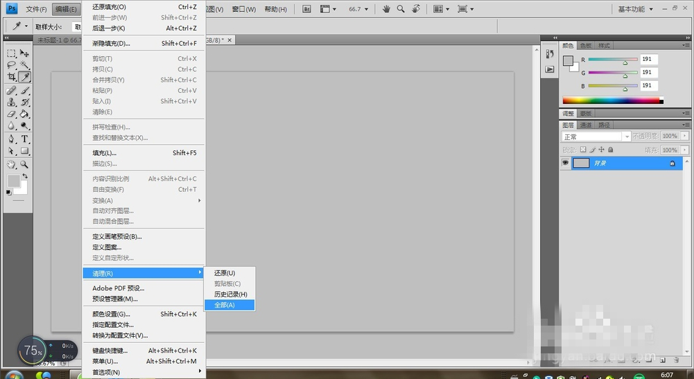 清理PS内存:执行-编辑—清理—全部,可以释放内存。