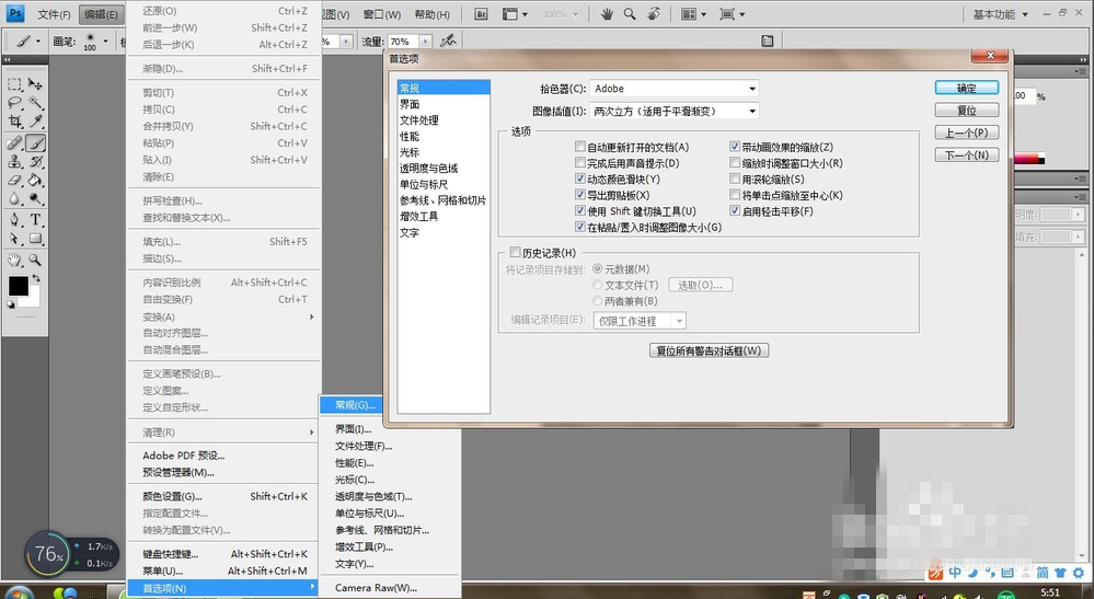 打开Photoshop软件,点击编辑-首选项-常规命令,快捷键Ctrl+K,打开编辑框,