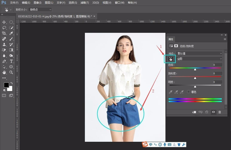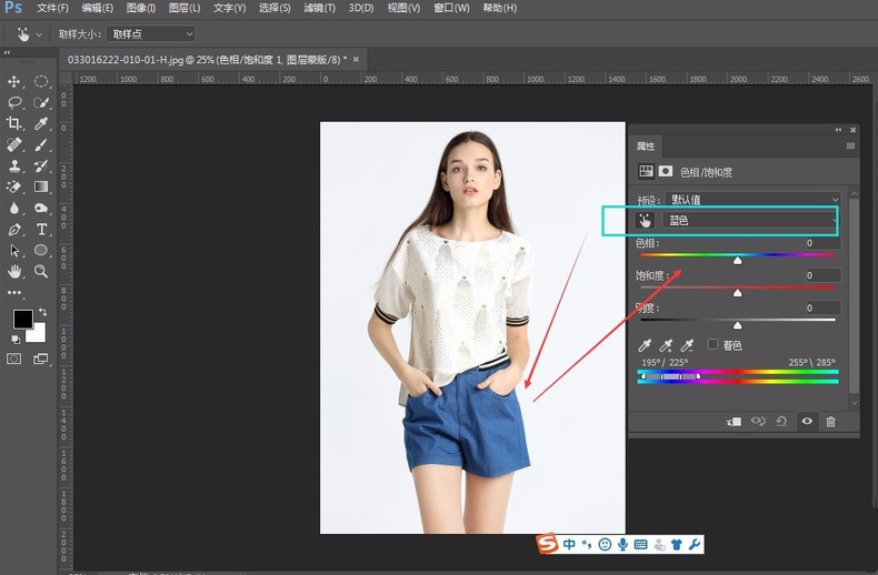 图片中点击颜色为蓝色,然后就可以调节色相来改变衣服的颜色。
