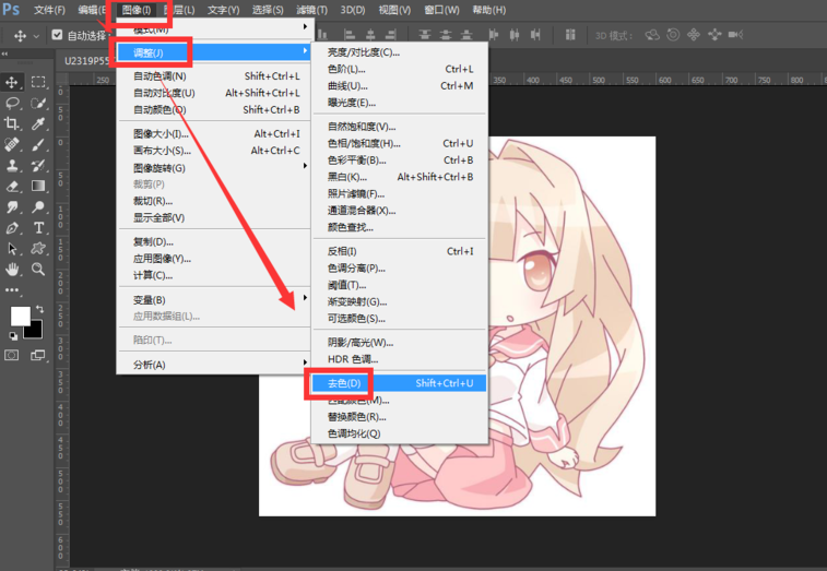 选中复制的图层,然后点击菜单栏中的图像-调整-去色【快捷键shift+ctrl+u】,
