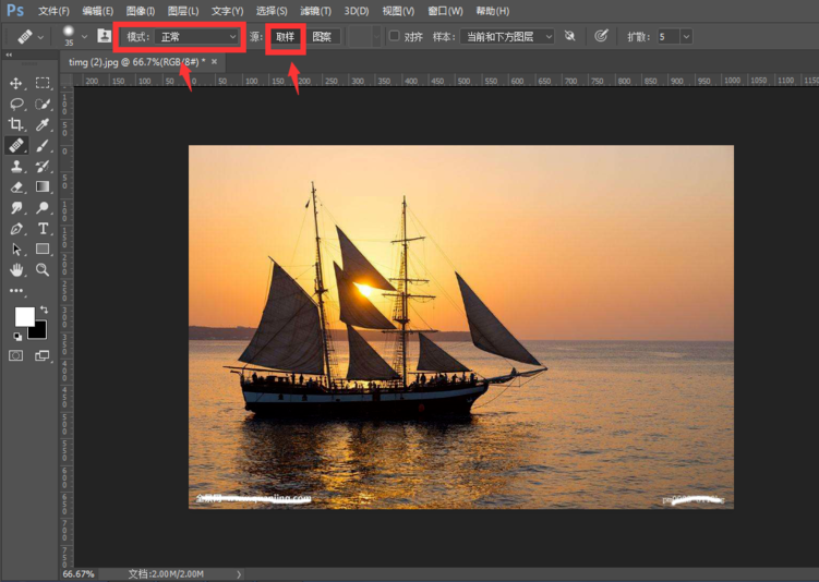 在属性栏中可以调节画笔大小和硬度,模式为正常,源选择取样,