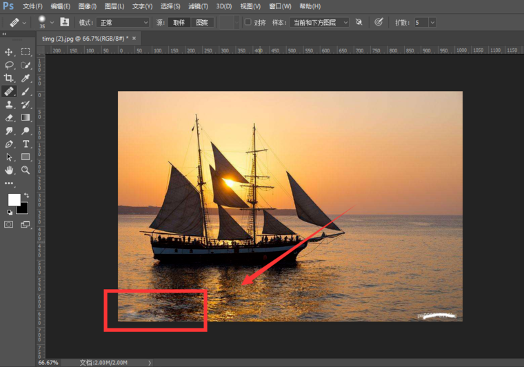 吸取附近景色后,松开alt键,用鼠标左键在原来的水印上涂抹,水印部分就会被附近吸取的景点覆盖,另一侧的水印采用同样的方法进行处理,