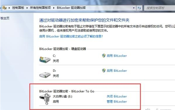 步骤三:依次打开【控制面板】→【BitLocker 驱动器加密】,然后找到自己的磁盘,点击【关闭 BitLocker】;