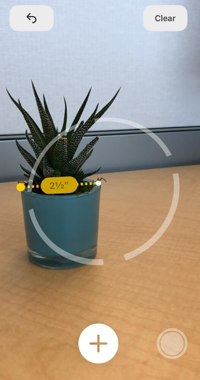 当设备检测到您要测量的物体是正方形或长方形,它会自动在物体周围放置一个测量框。轻点 +会显示物体的宽度和长度的测量结果。轻轻移动设备,将显示计算出的物体面积。
