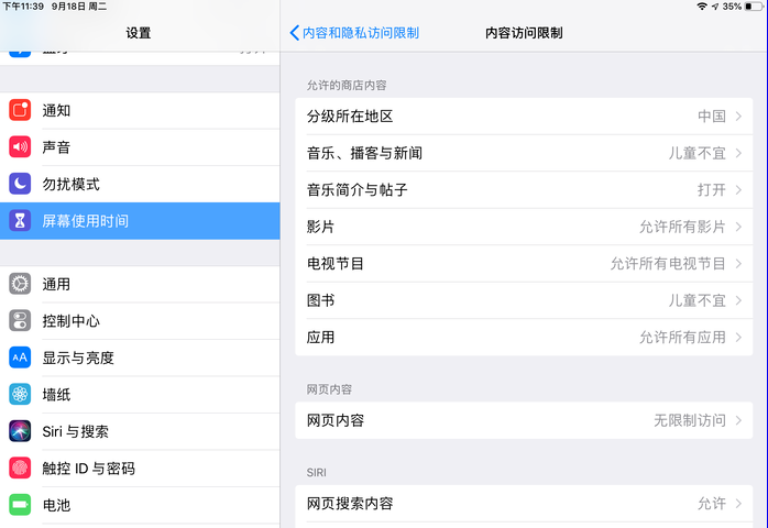在“屏幕使用时间”里,还带有内容访问限制,用户可以设定不允许访问的内容,例如少儿不宜的内容,还可以设定按照年龄来做限制的电视节目及图书及APP等项目。这里还有类似于安卓系统的权限管理功能,让用户可以设定某个APP所能使用的隐私权限。