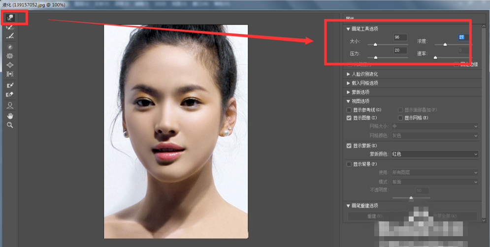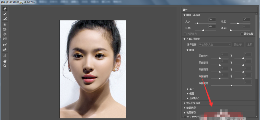 在液化中,选择第一个变形工具,在右侧属性中适当调整工具的大小、压力和浓度,