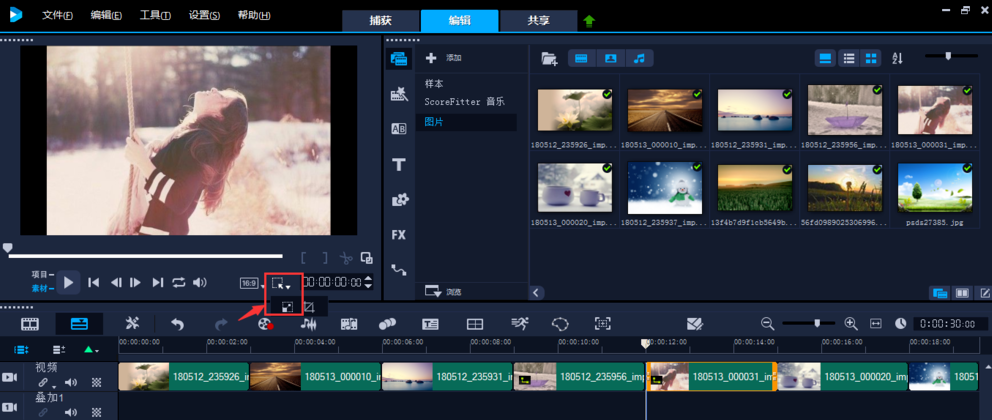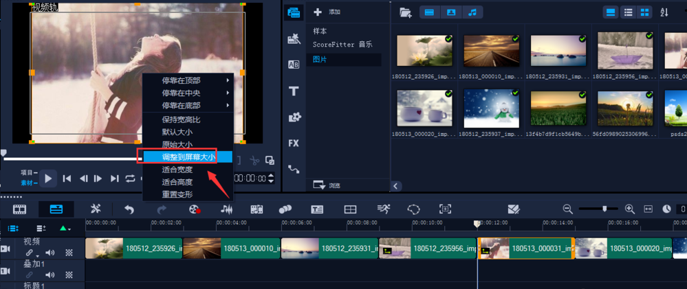 左侧为展示位置,点击选中轨道上的图片,可以将图片右键设置为-调整为屏幕大小,