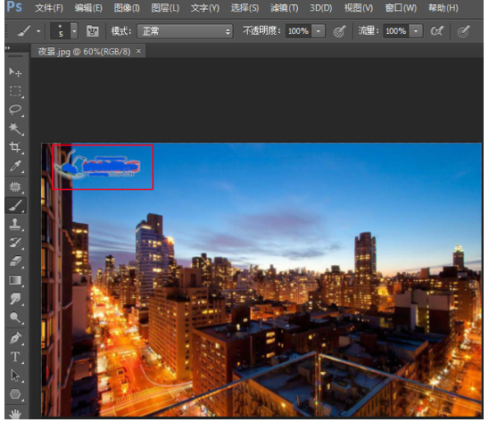 打开Photoshop软件,导入一张带有水印的图片,(为避免广告嫌疑,水印用画笔涂抹处理了)。