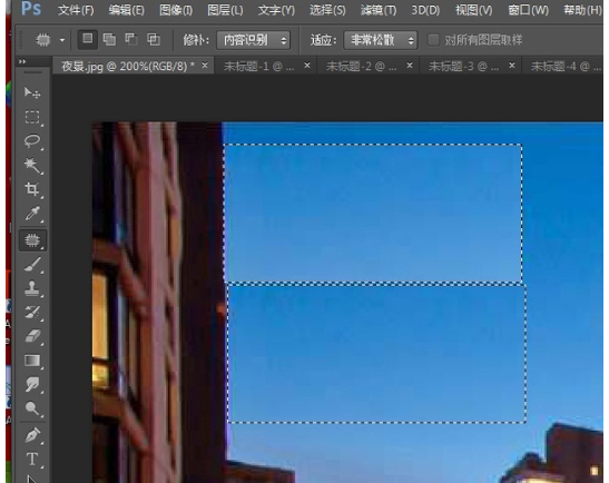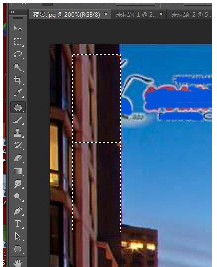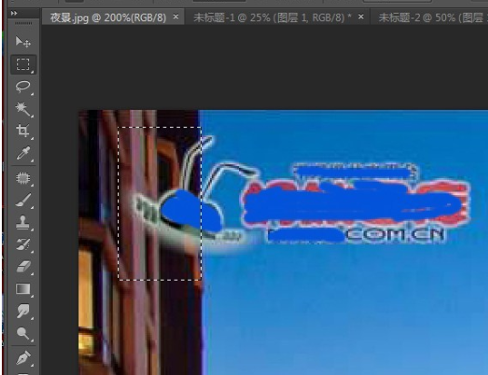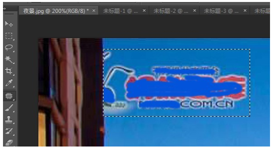 因为建筑物与天空色彩差异比较大,所以这里分两次去除水印。把图片放大到200%,这样看的更清楚,然后选择水印左边在楼房上的区域,这里一定要选准确,避免颜色对修复的干扰。