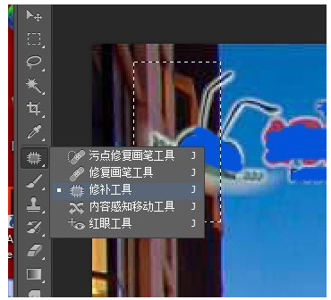 再选择“修补工具”,用鼠标左键拖拽的方法对该选区进行修补。