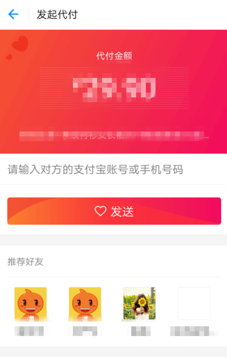 点击朋友代付,进入发起代付界面,输入好友的支付宝账户或手机号码,如图,