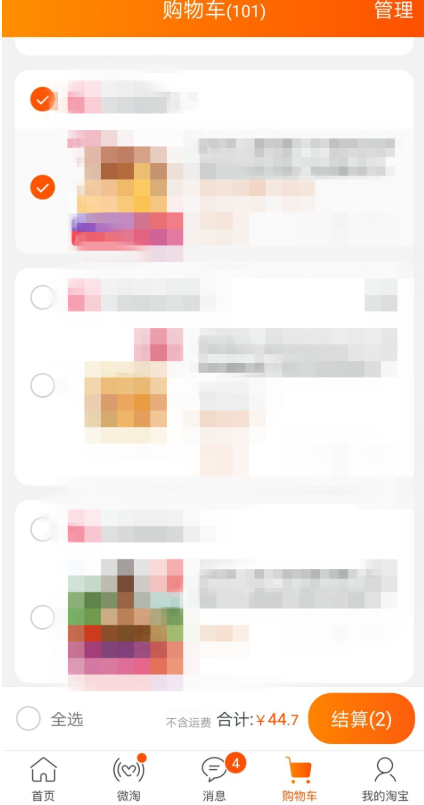 打开手机淘宝,点击进入购物车,勾选商品进行付款,