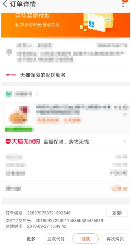 点击提交订单,进入付款页面、再返回,订单就没有付款成功,然后进入淘宝订单详情界面,如图,
