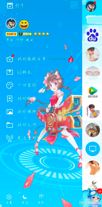 打开手机QQ,进入页面,右滑会出现新界面,点击“设置”选项。