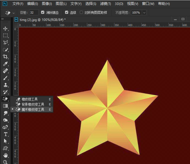 扣图大概是所有玩PS的小伙伴的一项最基本技能了,大凡有过科班或草台班经历的网友,都会随口说出一大串扣图技巧的名字。什么快速选择法呀、通道法呀、色彩范围法呀、多边形套索等等。但大家似乎都忘记了“橡皮擦”这个工具,比如下图这个案例,其他方法可能都需要一定时间,但借助“橡皮擦”→“魔术橡皮擦工具”,基本上一秒就能将图中的五角星扣下来了。