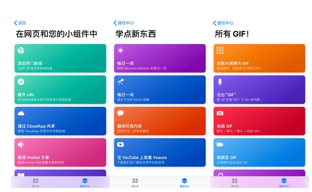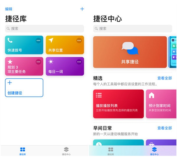 「捷径库」里面保存了已有的捷径。「捷径中心」则可以下载现存的捷径(包括官方分享和他人分享的),这里有多个分类,你可以根据分类去寻找自己需要的捷径。