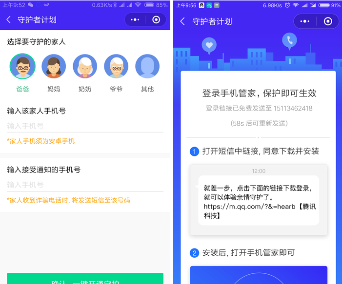 选择要守护的家人,然后填入该家人的电话号码(需与微信绑定的那个,需安卓手机)然后填入自己的手机号码,接着将邀请链接发送给对方。对方确认后,会被要求登录手机管家亲情守护版,稍后对应的手机号会收到下载链接,下载安装后手机管家亲情版后用微信登录即可完成登记操作。操作稍微麻烦,建议在家人身旁的时候进行操作。