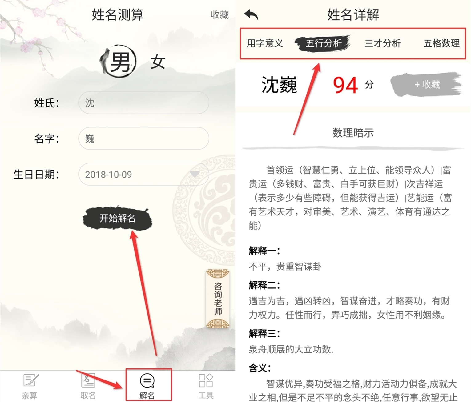 解名步骤:打开【宝宝起名取名专家】-选择【取名】-选择【男/女宝宝】-输入【姓氏】-输入【名字】-选择【生日日期】-点击【开始解名】