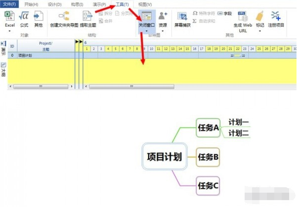 2.在工具菜单栏找到甘特图,点击打开窗口,在画布上方显示MindMapper甘特图窗口。