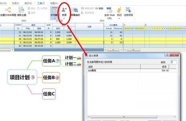 4.利用MindMapper甘特图窗口右侧的【资源】图标,我们可以定义和分配资源。