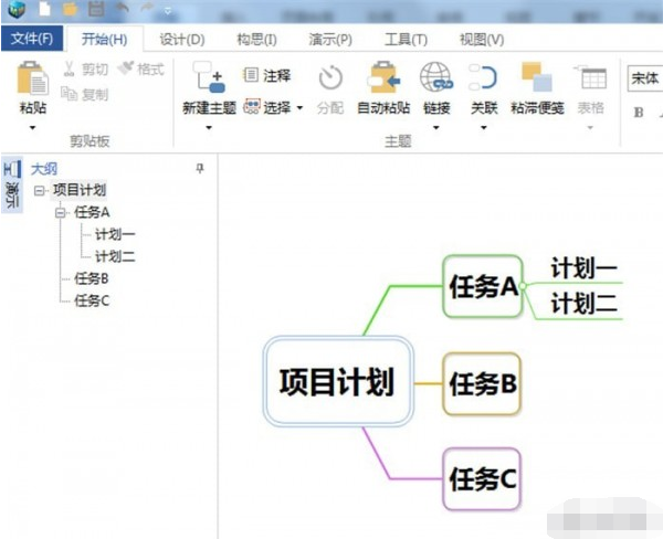 1.打开MindMapper思维导图软件,绘制项目管理任务计划,调出左侧的大纲可以直接显示思维导图的结构。