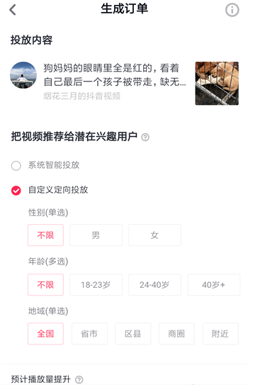 接着进入生成订单界面,这里默认的是系统智能投放,目前来说,一百块钱可以获得5000左右的播放量提升。