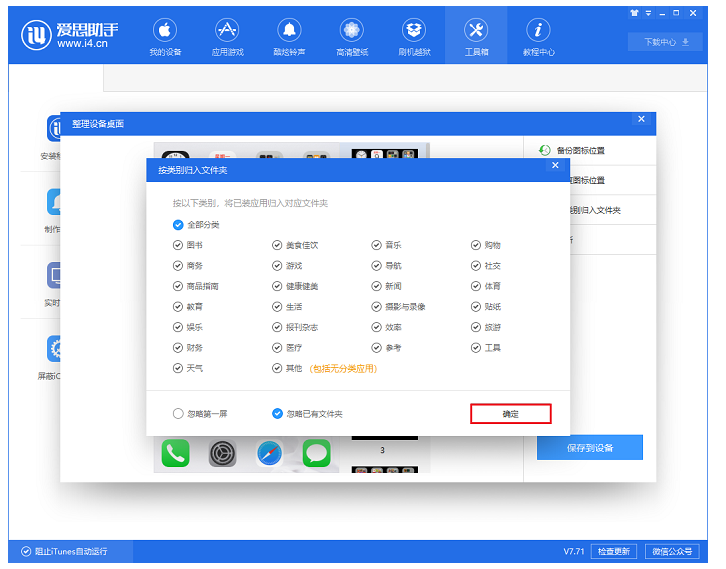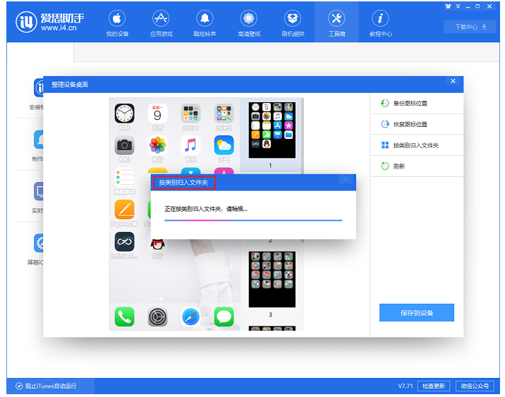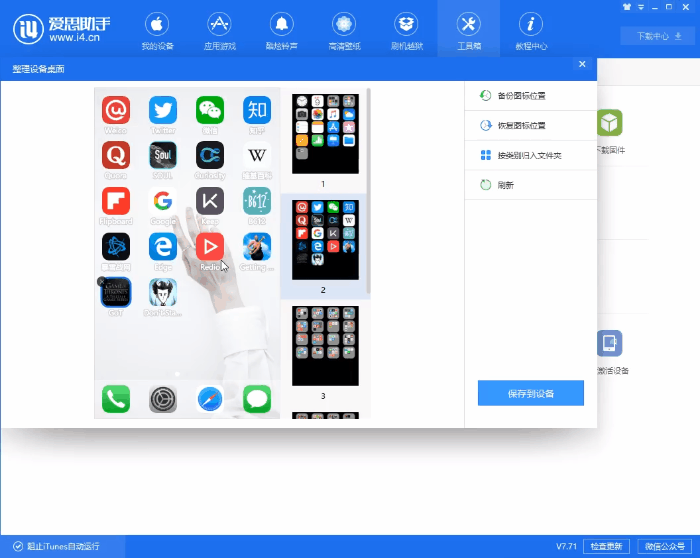 无论选择系统自动调整还是手动调整,在实时屏幕区域都可以预览图标位置,确认无误,点击【保存到设备】即可保存图标调整。