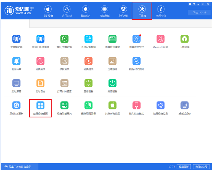 将手机与电脑连接,打开PC端爱思助手,点击【工具箱】,选择【整理设备桌面】。