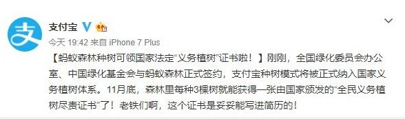 支付宝也来官宣了,只要用户在蚂蚁森林里种满3棵树就能获得一张由国家颁发的“全民义务植树尽责证书”,想想是不是有些激动呢?