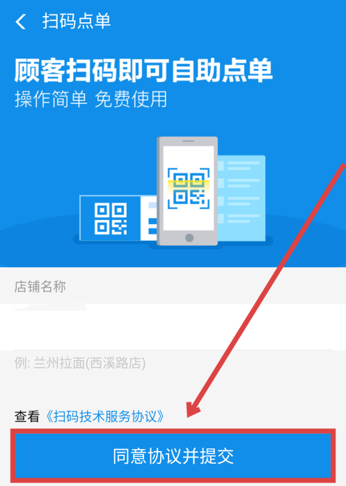 进入扫码点单界面,先填写你的店铺名称,然后点击“同样协议并提交”,