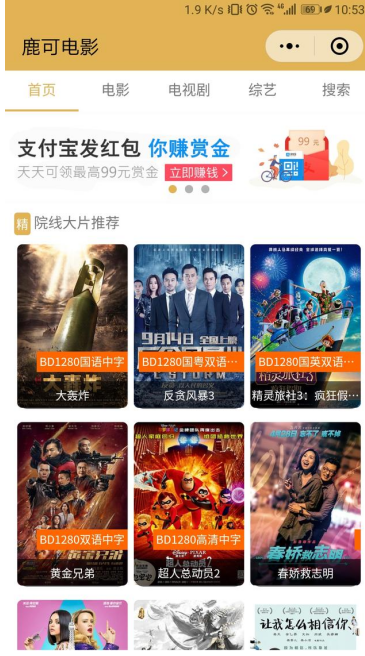 打开微信,搜索鹿可电影小程序,进入界面,我们可以看到它提供了丰富的影视资源,电影、热剧、综艺节目统统都有,功能相当强大。