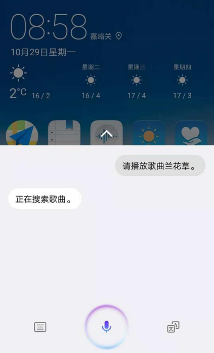 手机解锁状态下,从HOME键向上滑动可以快速调出语音控制,对着手机说出你的命令,比如对着手机说:请播放歌曲“兰花草”,手机会自动打开音乐播放软件,自动搜索这首歌曲并播放,如果是开车并自动连接蓝牙,优美的旋律就会从汽车音响响起。